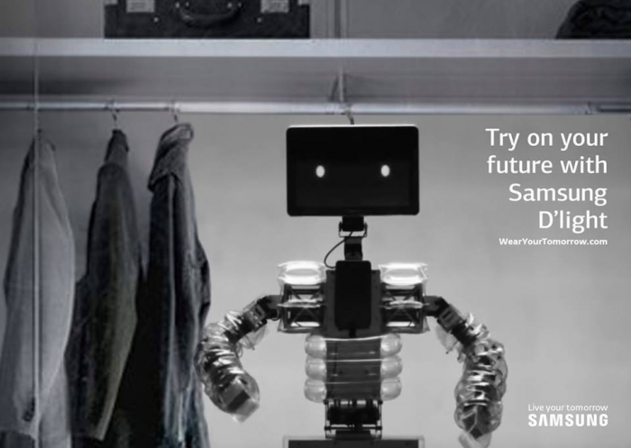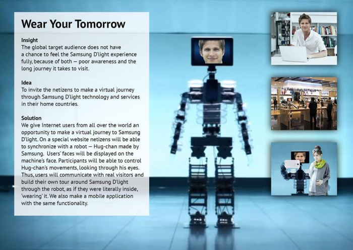 Получив бриф, мы засели за ресёрч. В результате увидели инсайт – Samsung D’light прекрасен благодаря своей интерактивной составляющей и технологиям будущего. Однако, чтобы проникнуться будущим, нужно в него попасть. Так возникло решение поставить в магазин робота, которым можно будет управлять через интернет, буквально «примерив» его тело, а, значит, увидеть будущее по версии Samsung D’light. Отсюда название нашей кампании – “Wear your tomorrow”. Можно двигать руками робота, а лицо пользователя будет транслироваться через веб-камеру на лицо-экран робота. К слову, не пришлось даже заново изобретать это чудо техники – у клиента оказалась уже разработанная модель робота Hug-Chun, мозг и сердце которого состоят из планшета Galaxy Tab и смартфона Galaxy S.