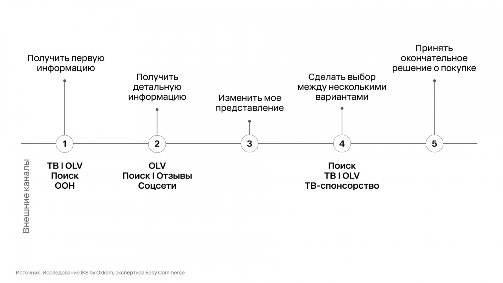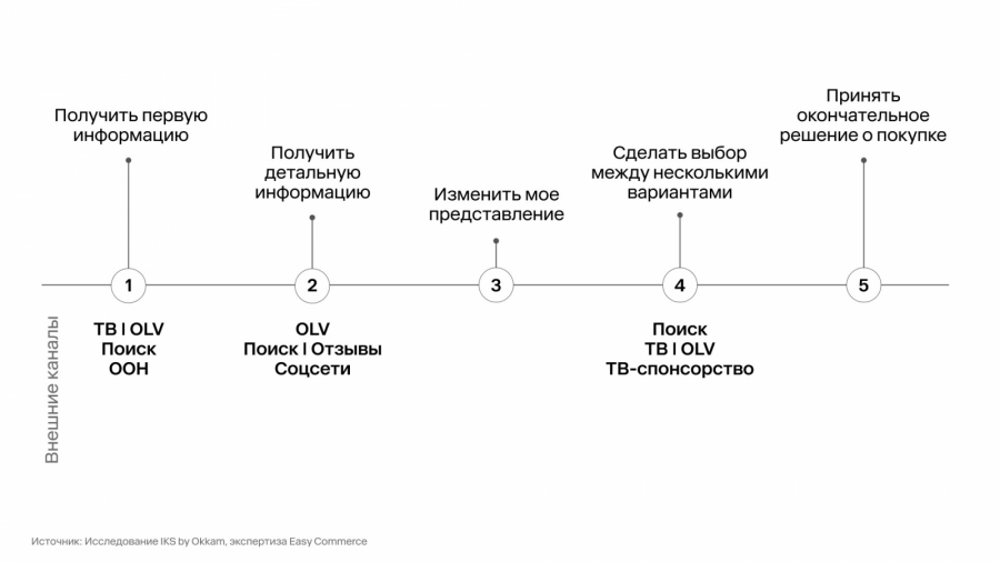Выбор маркетплейса начинается с коммуникации в охватных медиа. Первое знакомство с товаром и площадкой начинается с рекламы на ТВ, в поиске, диджитал-видео и OOH. На этом этапе лучше всего работают кобрендинговые коммуникации в связке товар-маркетплейс. Но они же продолжают оказывать влияние на решение покупателей на всех этапах пользовательского пути: детальную информацию потребители получают из диджитал-видео, отзывов и соцсетей, а на выбор между несколькими вариантами продукции также серьезно влияет ТВ-реклама и OLV.