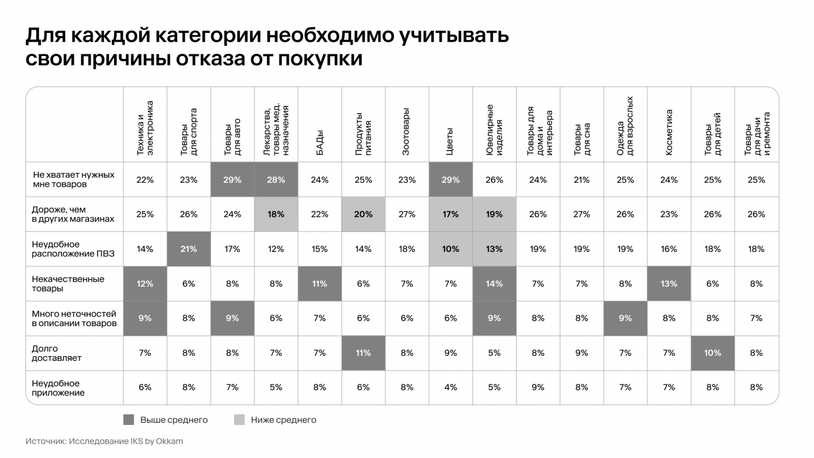 Исследование IKS показало, что внутри каждой товарной категории причины отказа от покупки разные. Несмотря на то, что общий набор причин один и тот же, каким-то из них пользователи уделяют заметно больше внимания, а другие считают менее значимыми. Вот они: