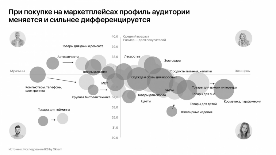 Наглядно эти отличия видны на примере товаров из категории электроники (КБТ, МБТ, мобильные телефоны, компьютерная техника). Если оценивать общий профиль покупателя, онлайн и офлайн такие товары покупают как мужчины (чуть чаще), так и женщины (чуть реже), на маркетплейсах же эти товары преимущественно выбирают и приобретают мужчины.