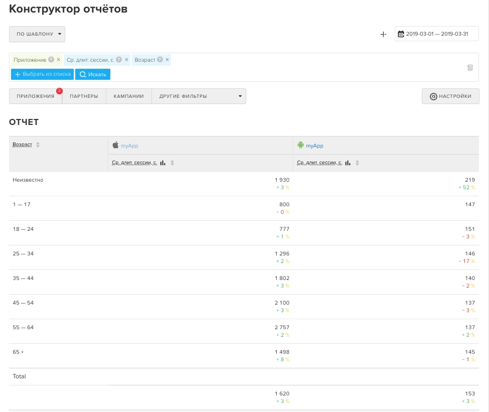 В дополнение к этому, некоторые системы аналитики позволяют смотреть данные по атрибуции в дополнительных разрезах. Например, myTracker предоставляет специальные опции для глубокого анализа приложения: