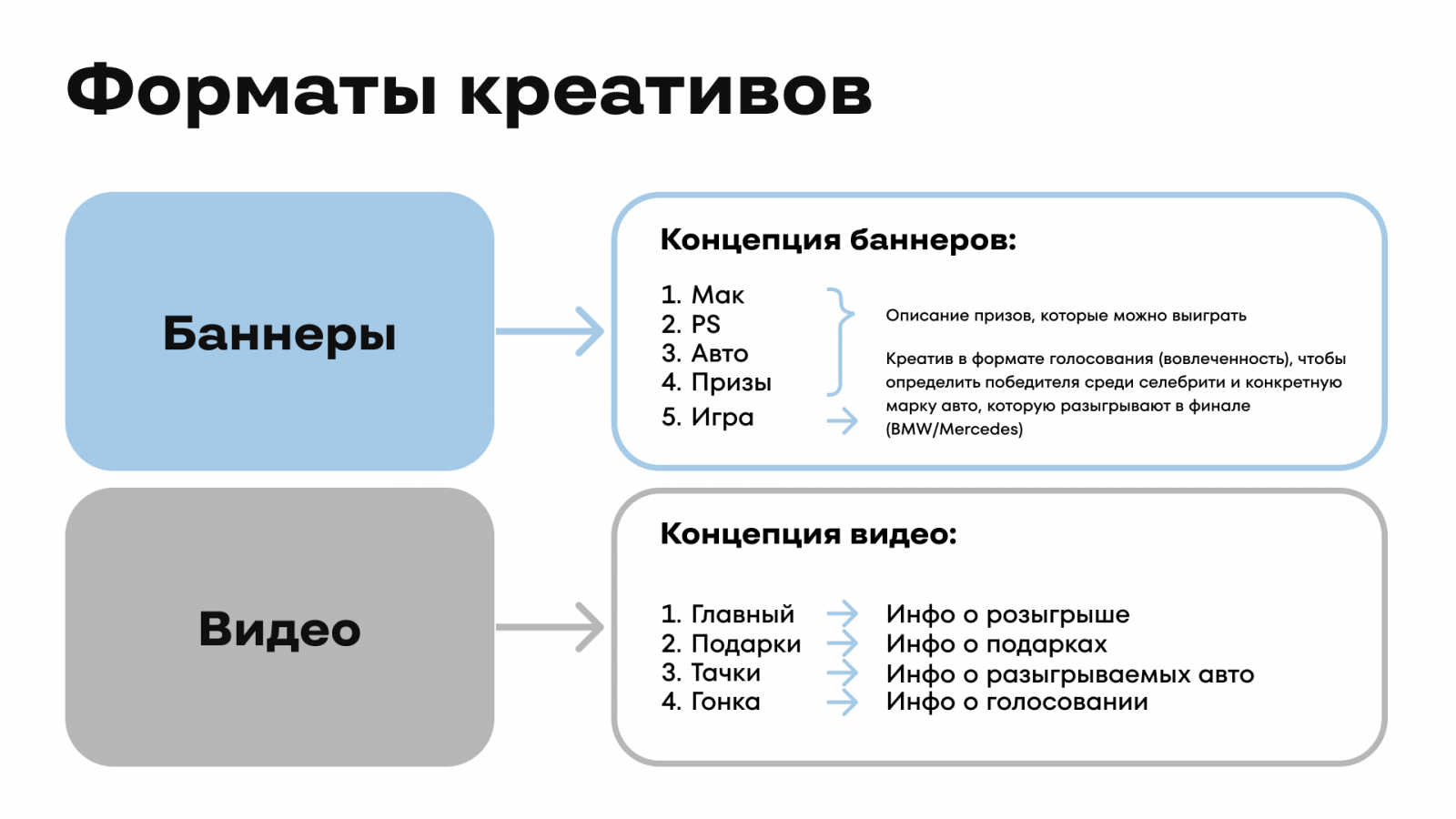 Креативы были представлены баннерами и видео. Баннеры отличались по концепциям: первые четыре — это описание призов, а пятый, под названием «игра», прошел в формате голосования; его сделали для повышения вовлеченности. Пользователи выбирали победителя среди двух селебрити. Один представлял автомобиль Mercedes, другой — BMW. В зависимости от того, какой селебрити побеждал, начинался розыгрыш определенной марки машины.