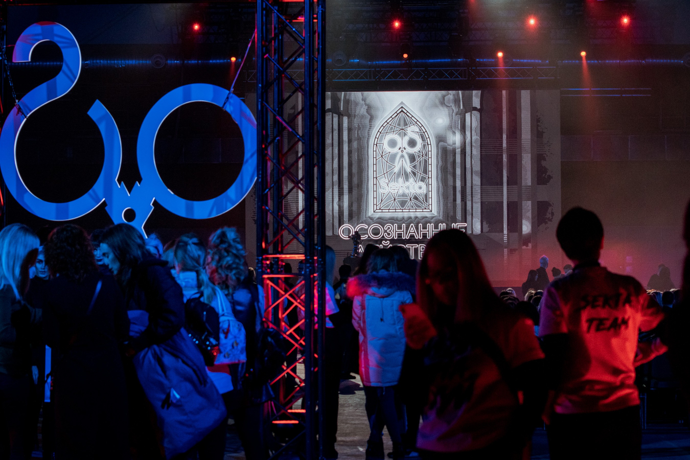 Храму нужен алтарь, объект для поклонения, главный артефакт. Огромное пространство площадки позволило построить в самом видном месте крупный арт-объект. Четырехметровые «ножницы» из логотипа Hair Sekta, как символ профессии и нашего храма, были подвешены на цепях внутри металлического конструктива и освещены так, что вызывали восторг и трепет у всех, кто входил в пространство мероприятия. Первое, что видели гости события после регистрации — огромный символ своей веры. Объект не только задавал тон всему событию и со входа погружал посетителей в атмосферу преданности своему делу, но и стал главным инста-спотом пространства — половина фотографий с мероприятия сделана гостями и спикерами на фоне алтаря.