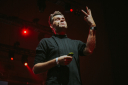 По своей сути конференционное мероприятие все время сопровождалось специально подобранной музыкой, свежей, агрессивной, задающей ритм и брутальную эстетику события. Аскетичное красно-белое освещение пространства не мешало доставке контента, но создавало ни на что не похожее пространство, живущее по своим правилам.