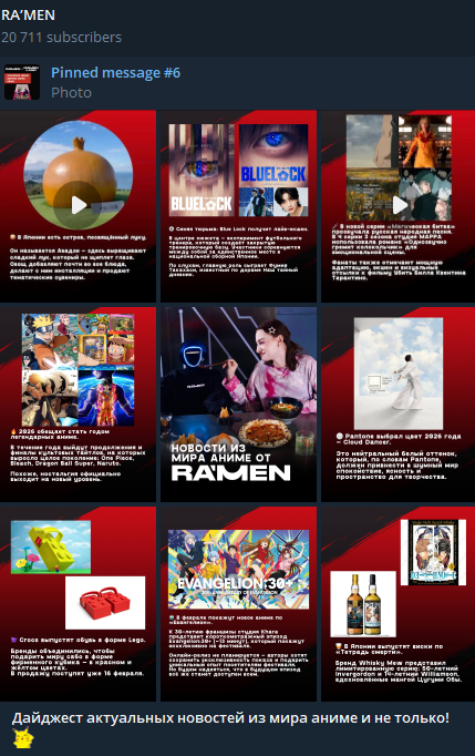 Мы строим SMM как медиа. Например, RA'MEN — бар в аниме-стилистике. В его Telegram-канале помимо новостей заведения публикуем посты о новых аниме-тайтлах. Аудитория остается, подписывается и не уходит, потому что получает полезный контент. Мы верим, что сообщества будут двигать маркетинг. Компании, которые вкладываются в них, в первую очередь зарабатывают доверие к бренду, а не просто клики.