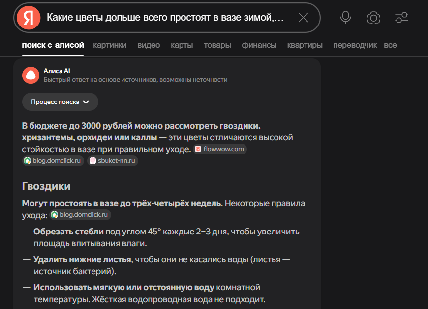 Поведение пользователей в сети меняется. Три года назад типичный запрос выглядел так: «купить цветы Москва доставка». Теперь пользователь ожидает не список ссылок, а готовый ответ с рекомендациями. Он открывает поиск с «Алисой AI» и пишет: «Какие цветы дольше всего простоят в вазе зимой, бюджет до 3000».