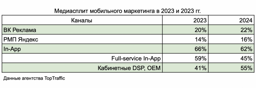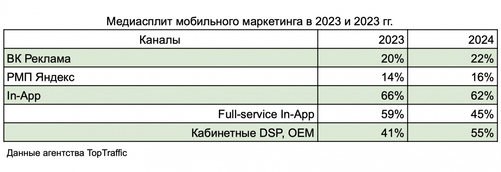 С 2022 по 2023 год произошли значительные изменения в медиасплите для мобильной рекламы. По оценке агентства TopTraffic, российские рекламные сервисы «Яндекс» и VK не смогли занять место Google, Meta (признана экстремистской и террористической организацией в России) и Apple, на долю которых приходилось 70% рынка мобильного маркетинга. Сейчас ситуация выглядит иначе: на «ВК Рекламу» приходится 20%, на РМП «Яндекс» —14%, а на остальные платформы мобильного маркетинга — 66%.