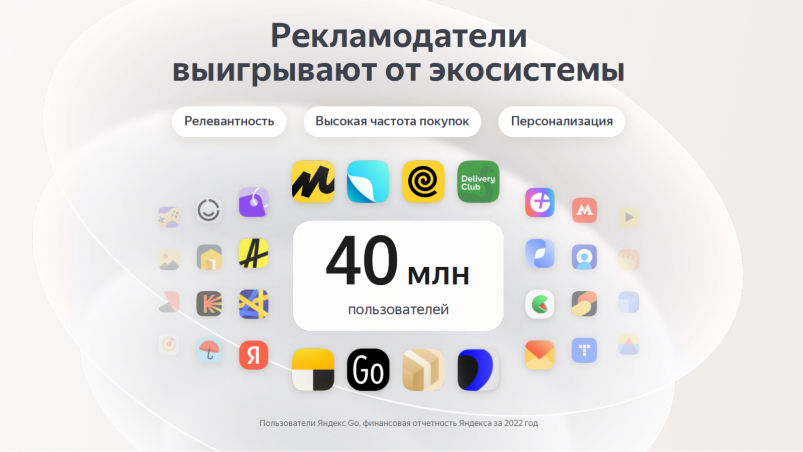 - Большая лояльная аудитория. Более 40 млн активных пользователей, которые закрывают свои потребности с помощью городских сервисов Яндекса: Маркета, Лавки, Еды, Delivery, Такси и других.