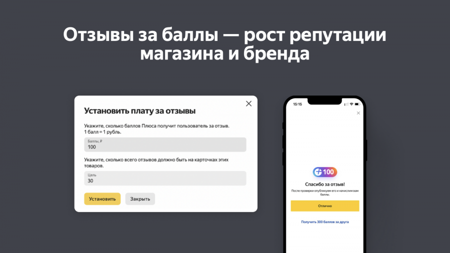 Чтобы подключить этот инструмент, нужно в личном кабинете выбрать товары, которым нужны отзывы, и указать размер кешбэка баллами Плюса. Таким образом продавец может собрать необходимое количество отзывов на товар и повысить его конверсию намного быстрее.