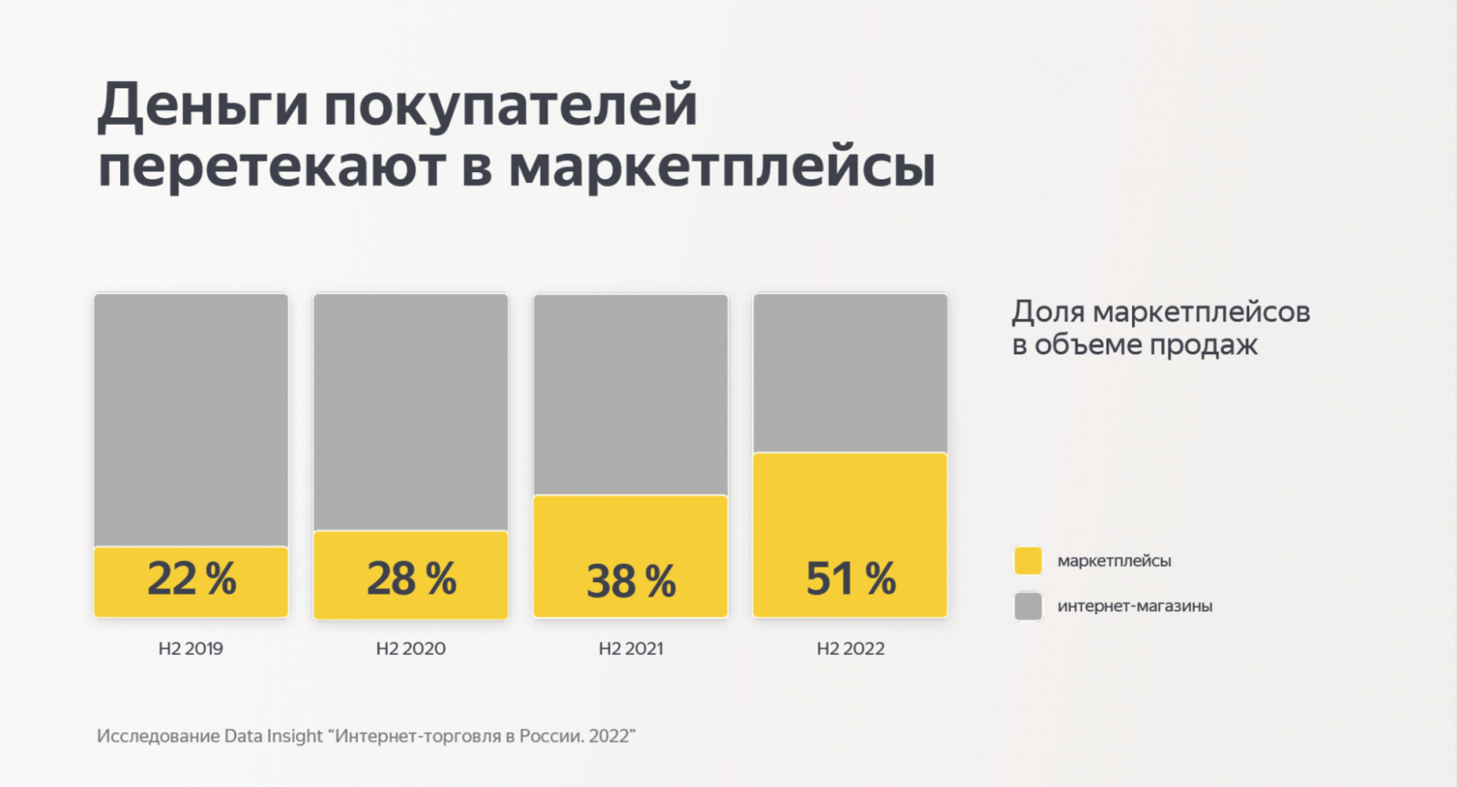 По данным исследования Data Insight, во втором полугодии 2022 года доля маркетплейсов в общем количестве заказов достигла 73% и впервые превысила половину всего объёма продаж. Покупатели всё чаще предпочитают другим площадкам маркетплейсы, так как это удобно: можно сравнивать цены и экономить силы и время, которые потребовались бы на поездку в магазин.