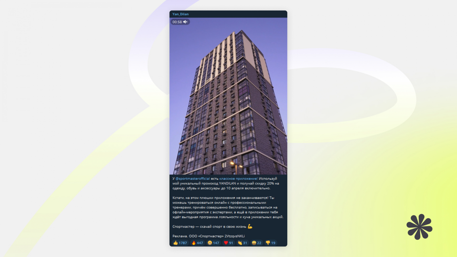 Интеграции с блогерами. Здесь всё понятно, но как выбрать нужного? Важно, чтобы ваши интеграции нативно вписывались в общую сетку блогера, а сам бренд разделял ценности персоналии. Лучше, если инфлюенсер сам подготовит пост, например, как это сделал Артур Диланян для «Спортмастера». И не забывайте сверяться со списком иноагентов, у которых рекламу лучше не покупать.