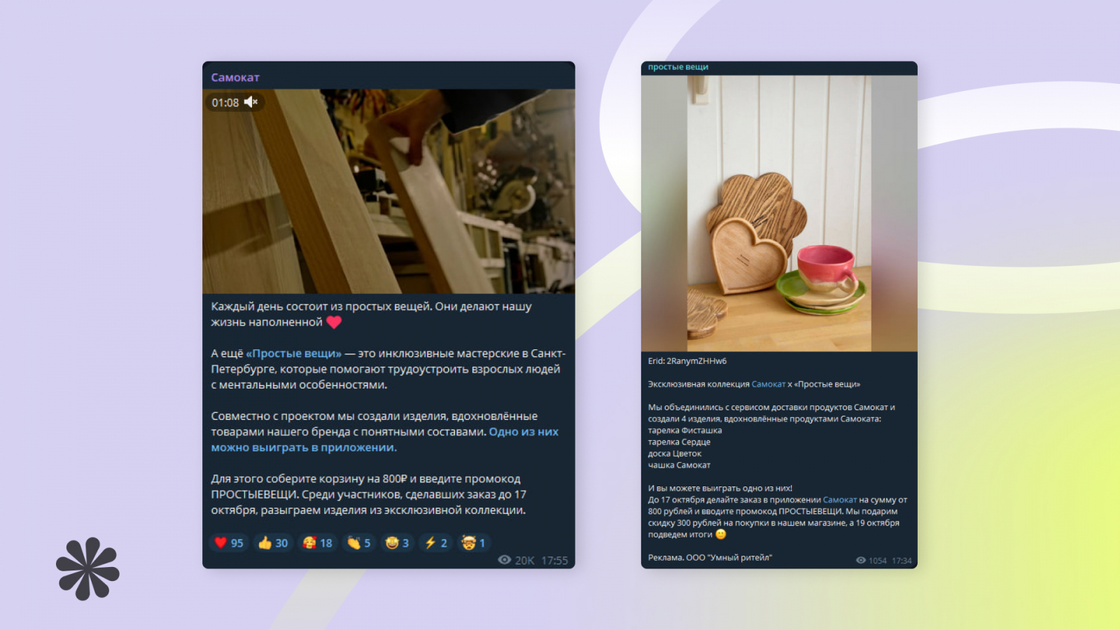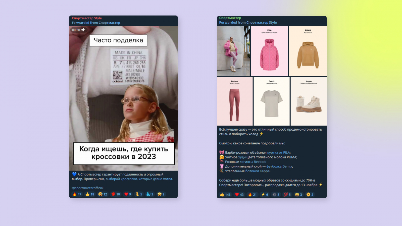 - Коллаборации. Два бренда решили сделать общую активность. Например, выпустить коллекцию одежды. Каждый рассказал эту новость в своём канале с упоминанием второго участника.