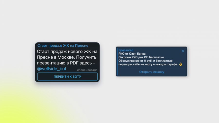 Рекламные сети «Яндекса» (РСЯ) в Telegram. Объявления размещаются в самом Telegram, но всё управление рекламными кампаниями осуществляется в интерфейсе «Яндекс Директ». Особенность в том, что плата такого объявления происходит за клики в течение первых 48 часов после публикации. После чего объявления снимаются с публикации в каналах. Из-за этого не все владельцы каналов желают работать через инструмент, так как по традиции прайсы выставлялись за пользовательские охваты, — то есть не за фактические клики, а за просмотры рекламы своей аудиторией. Из-за этого владельцам каналов выгоднее работать напрямую, ведь так они выставляют собственные условия и расценки за публикацию рекламы.