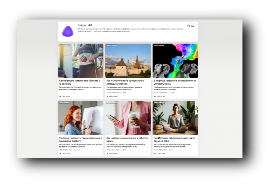 «ПромоСтраницы» обеспечивают вовлеченный контакт с аудиторией: в среднем статьи об «Алисе AI» читают по 2 минуты. Изначально в текстах мы пытались дать максимум пользы и показать плюсы использования нейросети в разных сферах жизни. Но заметили, что людям проще воспринимать узконаправленные статьи, поэтому решили писать более прицельно по тематикам. «ПромоСтраницы» хороши тем, что, даже если после запуска что-то идет не так, статьи можно пересобрать, доработать и использовать повторно. Это помогает достигать большей эффективности.
