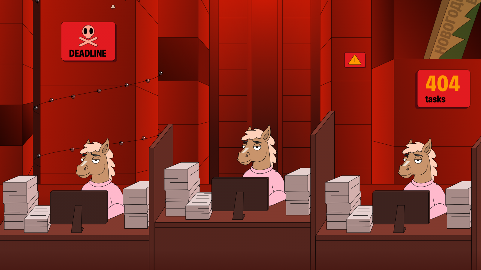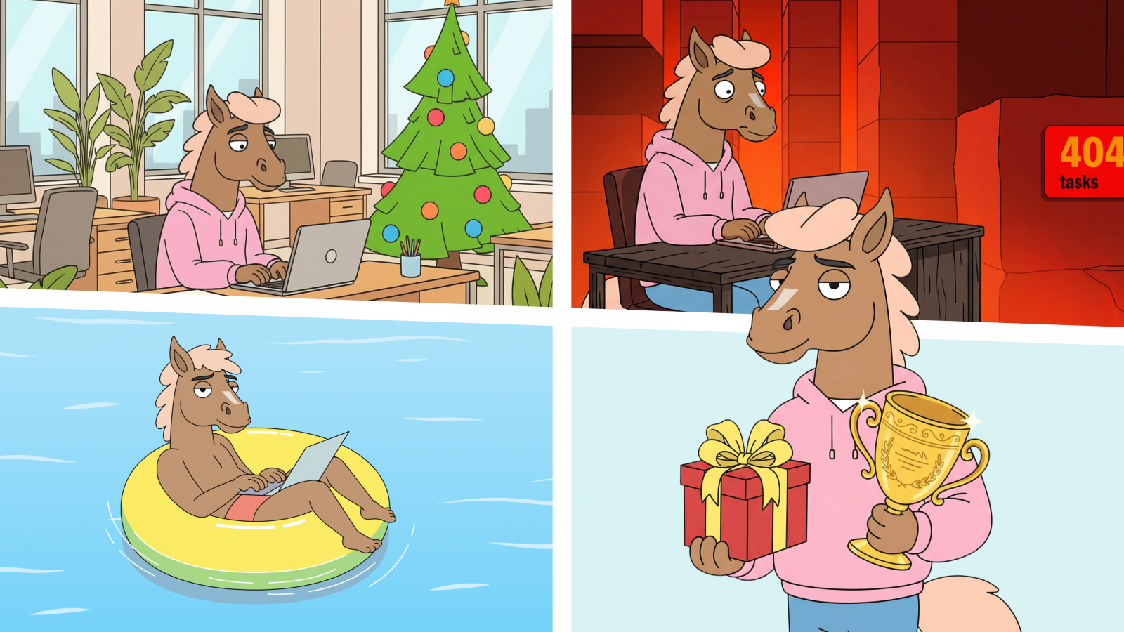 В зависимости от корпоративных «грехов» и добродетелей персонажи отправлялись либо в новогодний отпуск — с бассейном и чиллом, либо обратно в офис — с дедлайнами, холодным кофе и бесконечными «надо было еще вчера».