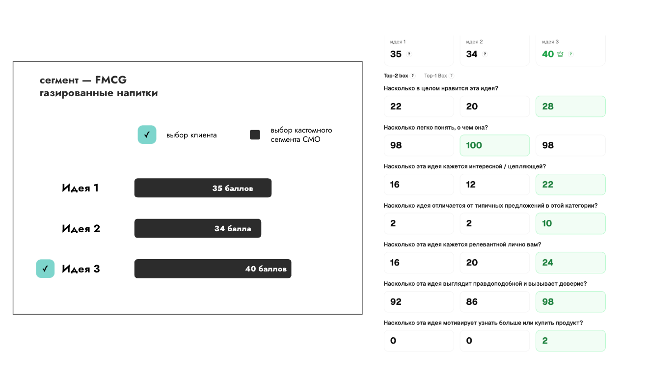 До запуска сегмент прошел серию внутренних тестов. Команда Fair Lab провела слепое сравнение: взяла пять реальных питч-кейсов с известным исходом — два выигранных тендера и три проигранных — и прогнала их через сегмент. В четырех из пяти случаев оценки цифровых респондентов совпали с реальным результатом: синтетические CMO отмечали те же слабые места, которые потом фигурировали в обратной связи от живых клиентов.