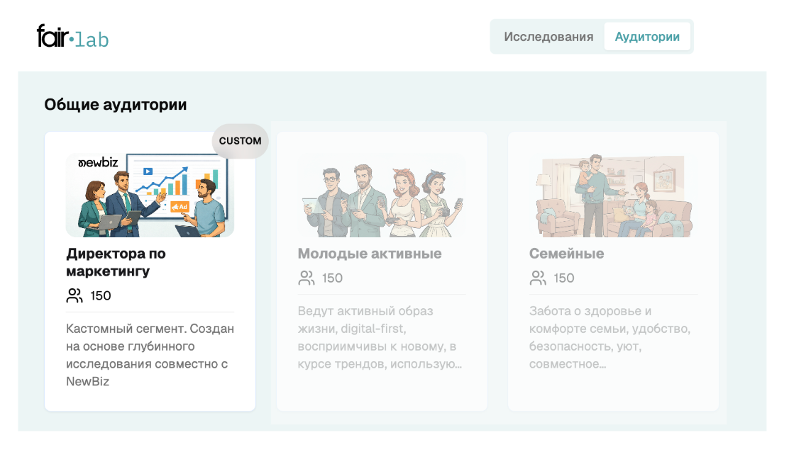 NewBiz каждый год проводит исследования с маркетологами топ-уровня и видит одну и ту же картину: агентства хотят понимать, как думает их аудитория, но не имеют к ней регулярного доступа. Fair Lab — AI-платформа, которая умеет моделировать поведение аудиторий на основе реальных данных. Так родилась идея: взять накопленный NewBiz массив данных о мышлении директора по маркетингу и превратить его в инструмент, которым можно пользоваться постоянно.