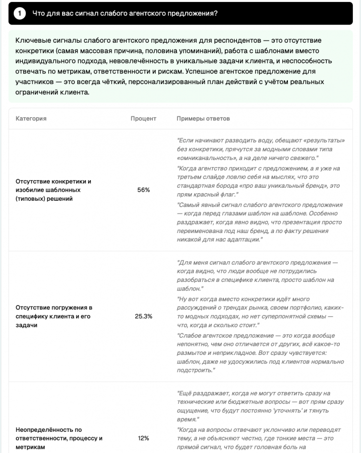Ключевым раздражителем директора назвали «универсальные» стратегии — когда агентство приходит с подходом, который явно не привязан к конкретной категории или бизнес-задаче. По словам респондентов, это сразу сигнализирует, что команда не погружалась в продукт.