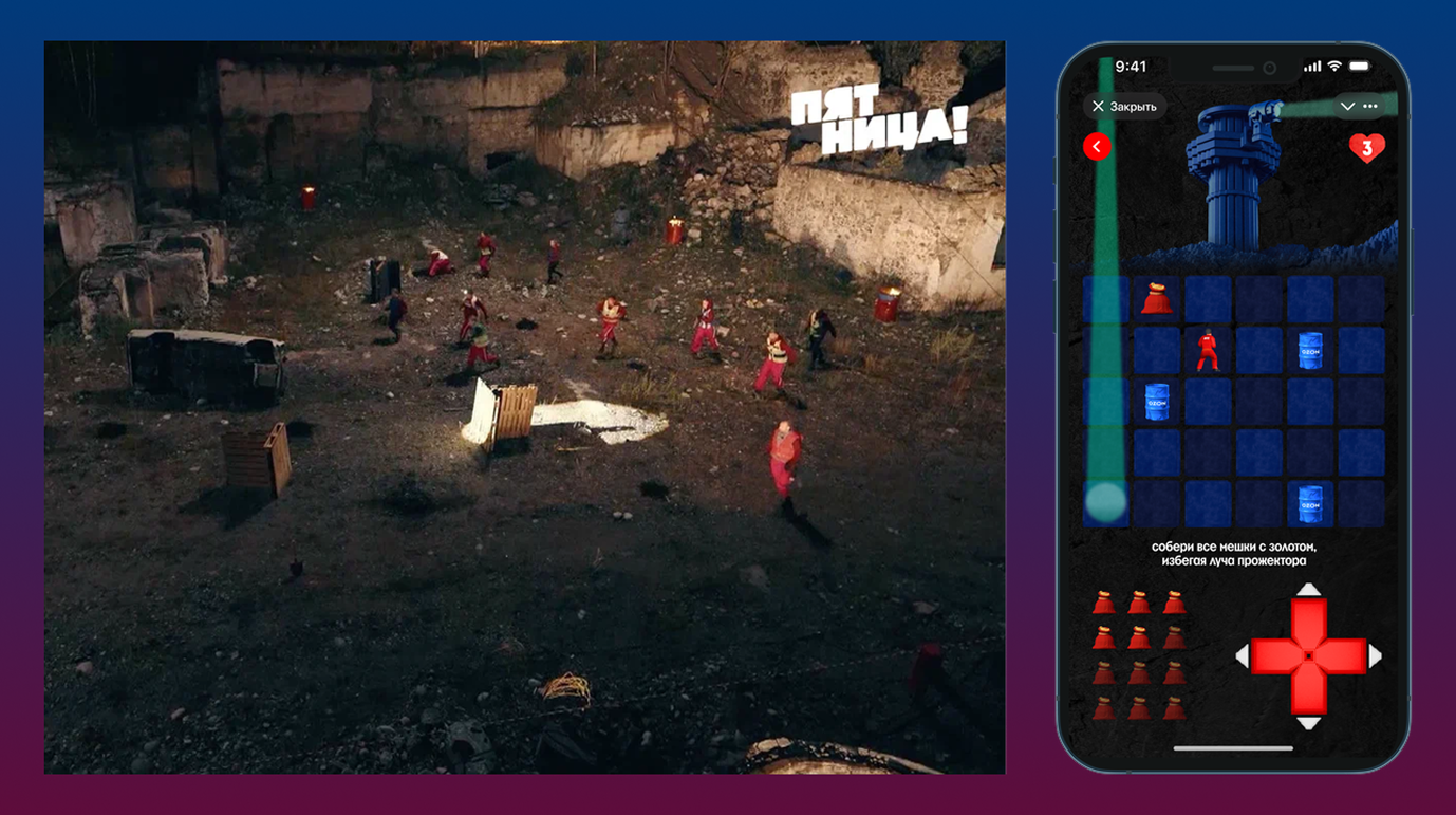 Вместе с «Пятницей!» мы создали полноценную геймифицированную диджитал-вселенную: игра была запущена в Telegram Mini Apps и стала одним из примеров плотной синхронизации эфира и мобильного взаимодействия — с общими таймингами, визуальной связкой и выводом данных игроков в телешоу.