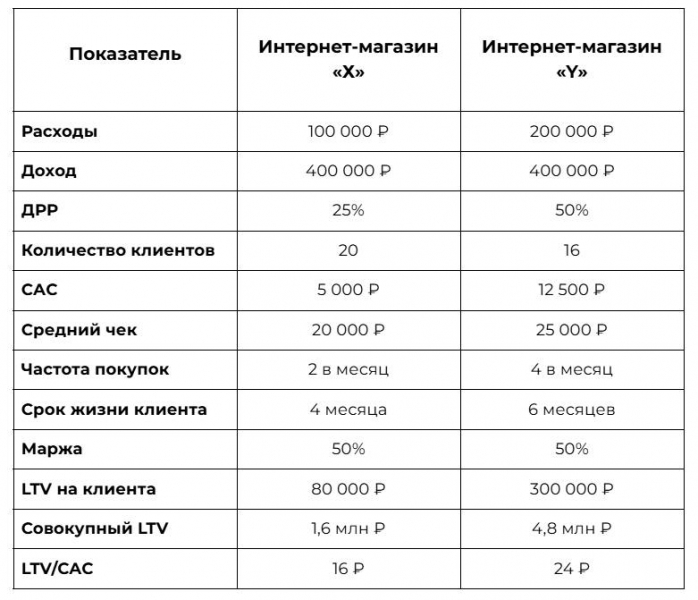 Однако сам по себе показатель ДРР не отвечает на главный вопрос — насколько выгоден привлеченный клиент в долгосрочной перспективе. Для комплексной оценки стоит учитывать стоимость привлечения (CAC) и пожизненную ценность клиента (LTV). Рассмотрим на примере двух интернет-магазинов.