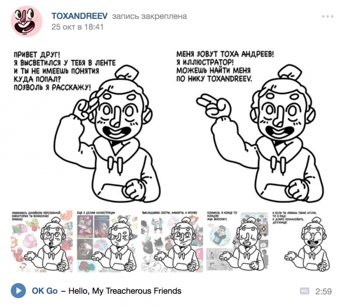 Так, например, художник TOXANDREEV после того, как его сообщество отметил «Прометей», опубликовал приветственную серию иллюстраций для новых участников.