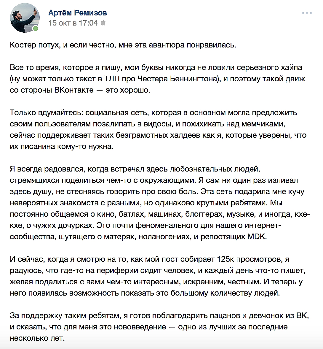 Социальные сети открывают творческим людям прямой канал для связи с аудиторией. Канал без посредников. Современных талантов на большую эстраду несут на руках тысячи преданных фанов, а не продюсеры в деловых костюмах. В России молодые звёзды приходят из ВКонтакте. Художники Duran, Gudim и Покрас, музыкант Макс Корж, рэперы Face и Скриптонит. Для автора публиковать свои работы ВКонтакте — возможность завоевать популярность.