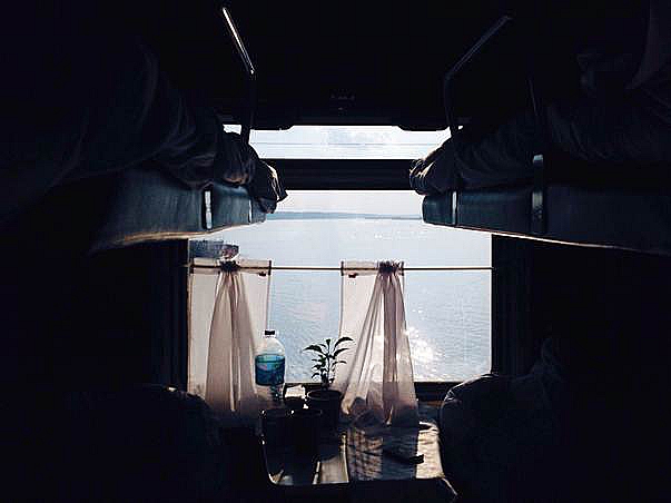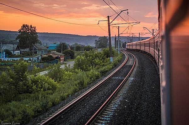 - Из окна вагона — железная дорога, поезда и мелькающие за окном пейзажи.
