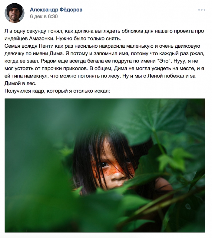 - Александр Фёдоров — фотожурналист, который путешествует по самым опасных уголкам планеты и никогда не выпускает камеру из рук. Однажды ему пришлось двое суток провести в тундре и спать на голом снегу;