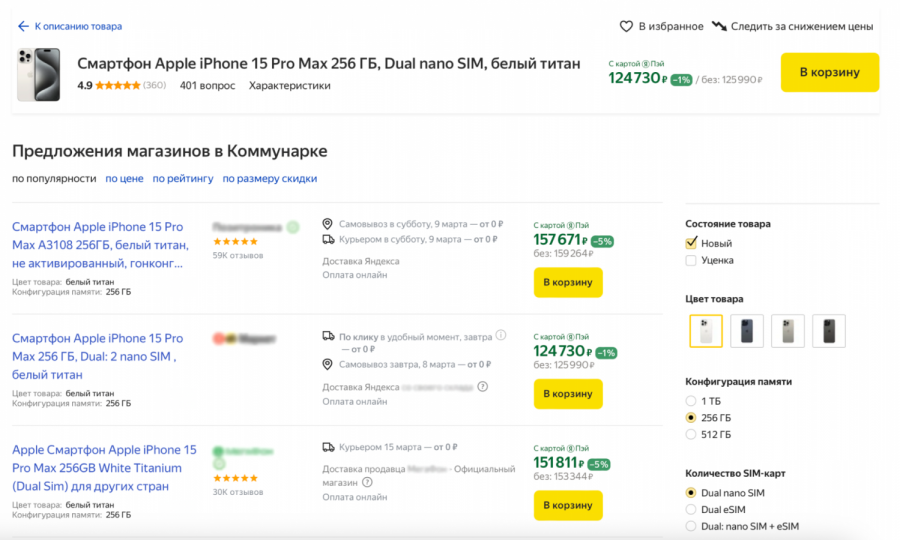 Иначе дела обстоят у «Яндекс Маркета» и «Мегамаркета». Эти площадки формируют единую карточку товара для каждого продукта, а внутри неё пользователи видят предложения от продавцов с разными ценами, сроками доставки, акциями и кэшбеком.