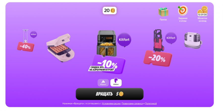 Рядом с ним появилось брендовое колесо Kitfort, перейти в которое пользователь может по одной кнопке. Чтобы воспользоваться акцией от бренда, необходимо иметь на своем балансе в колесе призов хотя бы 5 монеток — это стоимость вращения в колесе Kitfort. После вращения пользователю выпадает приз: это могут быть скидки на разные категории товаров и товаров бренда на «Яндекс Маркете», а также специальные призы на товары стоимостью в 1 руб.