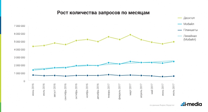 «Можно увидеть, что абсолютно во всех рассматриваемых случаях динамика прироста запросов с мобильных значительно превышает показатели десктопов и планшетов».