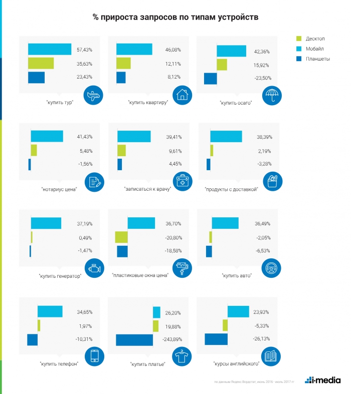 Запросы «записаться к врачу», «купить авто» и «купить генератор» выросли больше остальных. Интересно, что запрос «купить осаго», для которого общая доля количества мобильного интереса была самой низкой (12,4%), находится на пятом месте по приросту мобильного трафика (+39,4%).