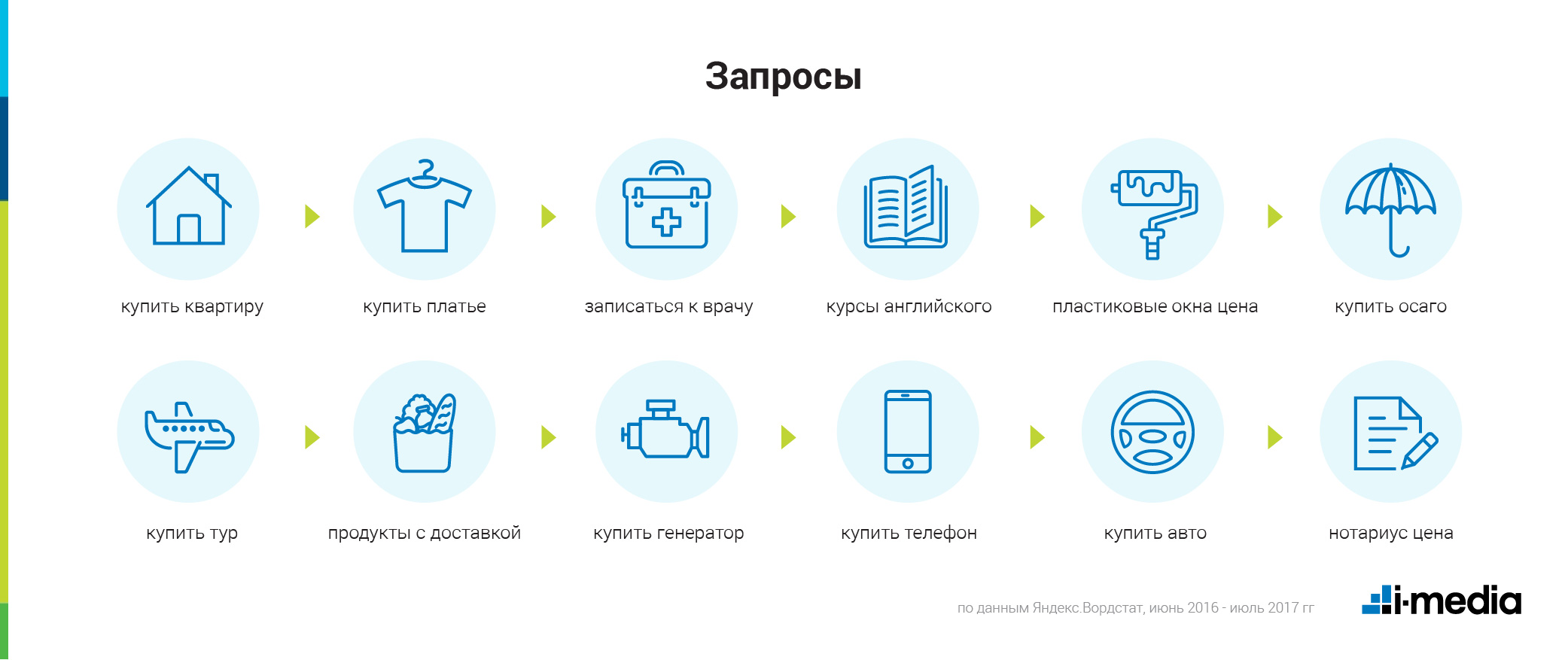 Для нашего экспресс-анализа мы выбрали 12 частотных запросов из популярных тематик, отражающих заинтересованность пользователя в совершении покупки товара или услуги.