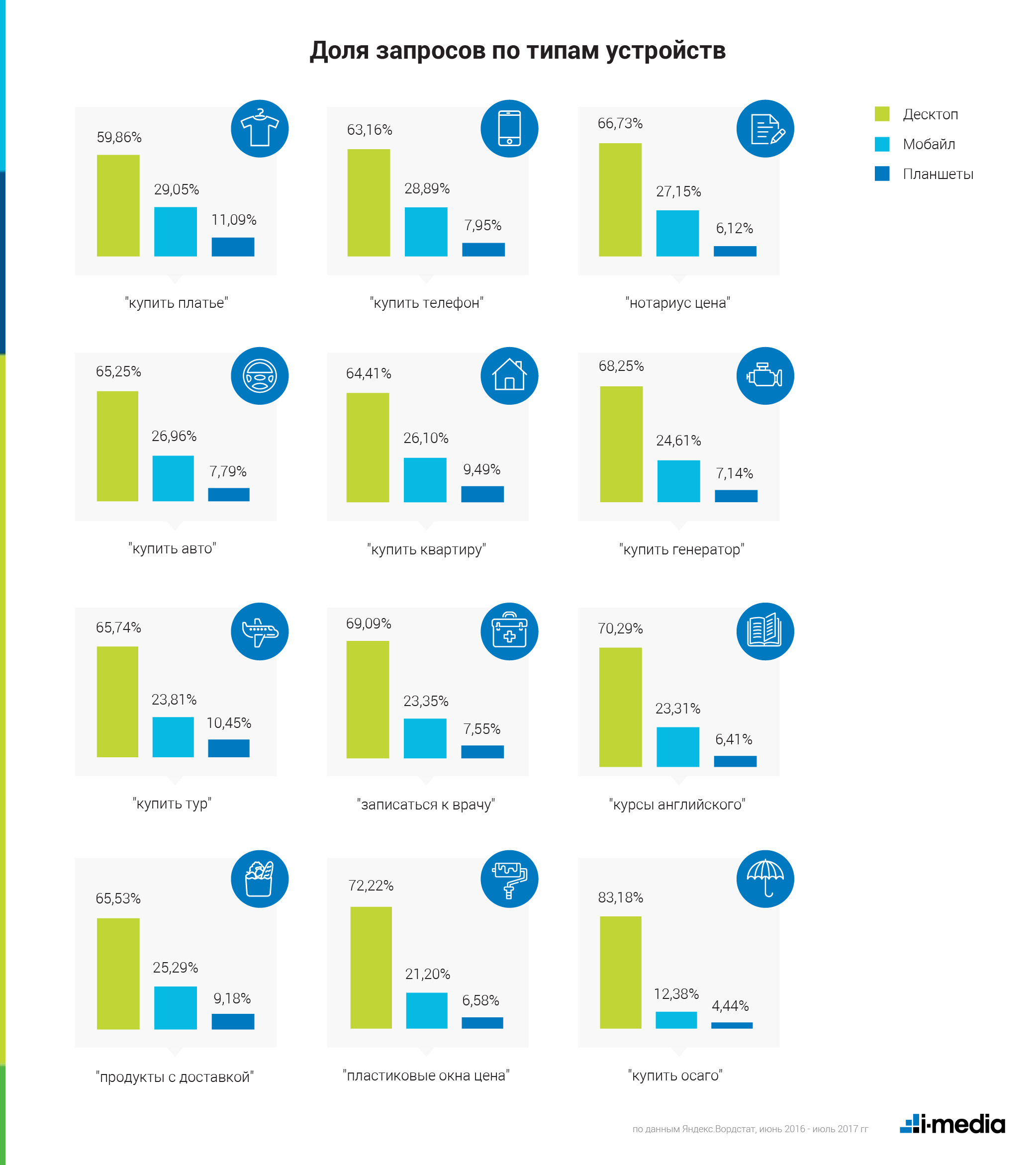В разрезе тематик картина несколько отличается. Самая большая «мобильная» доля у запросов «купить платье» и «купить телефон» - оба набрали по 29%. Самый скромный результат показали запросы «пластиковые окна цена» и «купить осаго» - 21% и 12% соответственно.