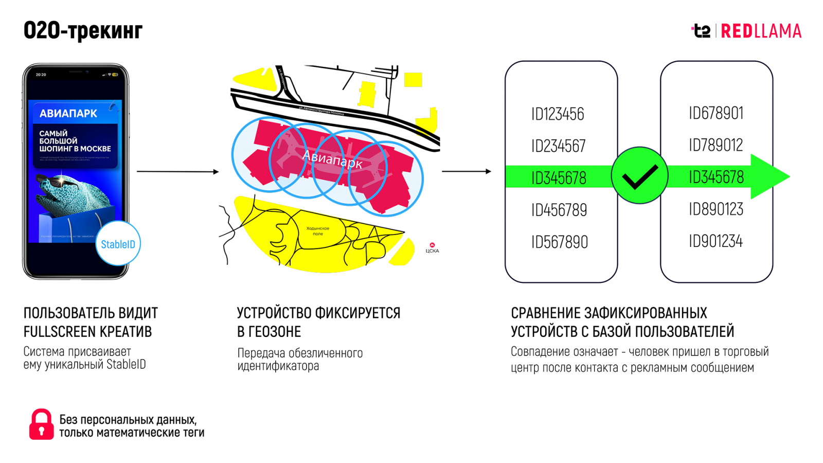 Когда пользователь видел наш fullscreen-креатив в мобильном устройстве, система присваивала ему уникальный StableID — анонимизированный цифровой идентификатор. Никаких персональных данных, только математическая метка. Также при появлении пользователя в геозоне ТЦ «Авиапарк», телеком-оператор фиксировал координаты и передавал его обезличенный идентификатор. В итоге наш алгоритм сравнивал их с базой пользователей, видевших рекламу. Последовательное совпадение означало одно — человек пришел в торговый центр после контакта с рекламным сообщением.