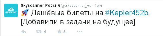 По данным издания Newsthump, авиакомпания Ryanair предложила своим клиентам бюджетные билеты на новую планету. Генеральный директор перевозчика Майкл О'Лири заявил: "Это очень важно для нас - сохранить позиции ведущего поставщика дешевых перелетов в труднодоступные местах". По словам руководителя, Kepler-452b будет прекрасным местом для отпуска. Предположительно, билет на планету будет стоить около 20 евро.