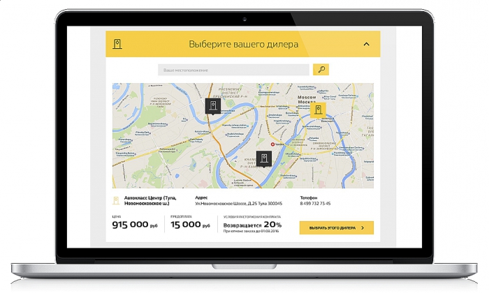 Кульминация проекта состоялась 23 июня, когда началась полноценная он-лайн продажа автомобилей. Работает это так: клиент заходит на сайт, в шоу-рум, выбирает нужную комплектацию и опции, выбирает дилера на интерактивной карте, получает конкретное предложение по цене от выбранного дилера, совершает предоплату (десять-пятнадцать тысяч рублей) и получает предварительный договор о покупке автомобиля, где оговариваются все условия. К слову, покупатель может полностью вернуть предоплату, если он передумает. А чтобы внести всю сумму и подписать договор купли-продажи уже нужно явиться в салон дилера лично, что можно сделать в день выдачи автомобиля.