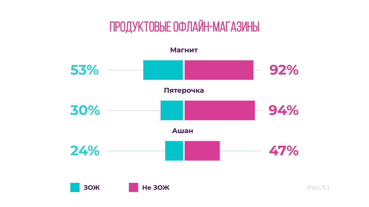 Анализ посещений продуктовых офлайн-магазинов показал, что среди ЗОЖников процент почитателей таких точек ниже, по сравнению с не ЗОЖниками. Причина может быть в том, что любители футбола, ведущие здоровый образ жизни, часто заказывают еду на дом или покупают спортивное питание.