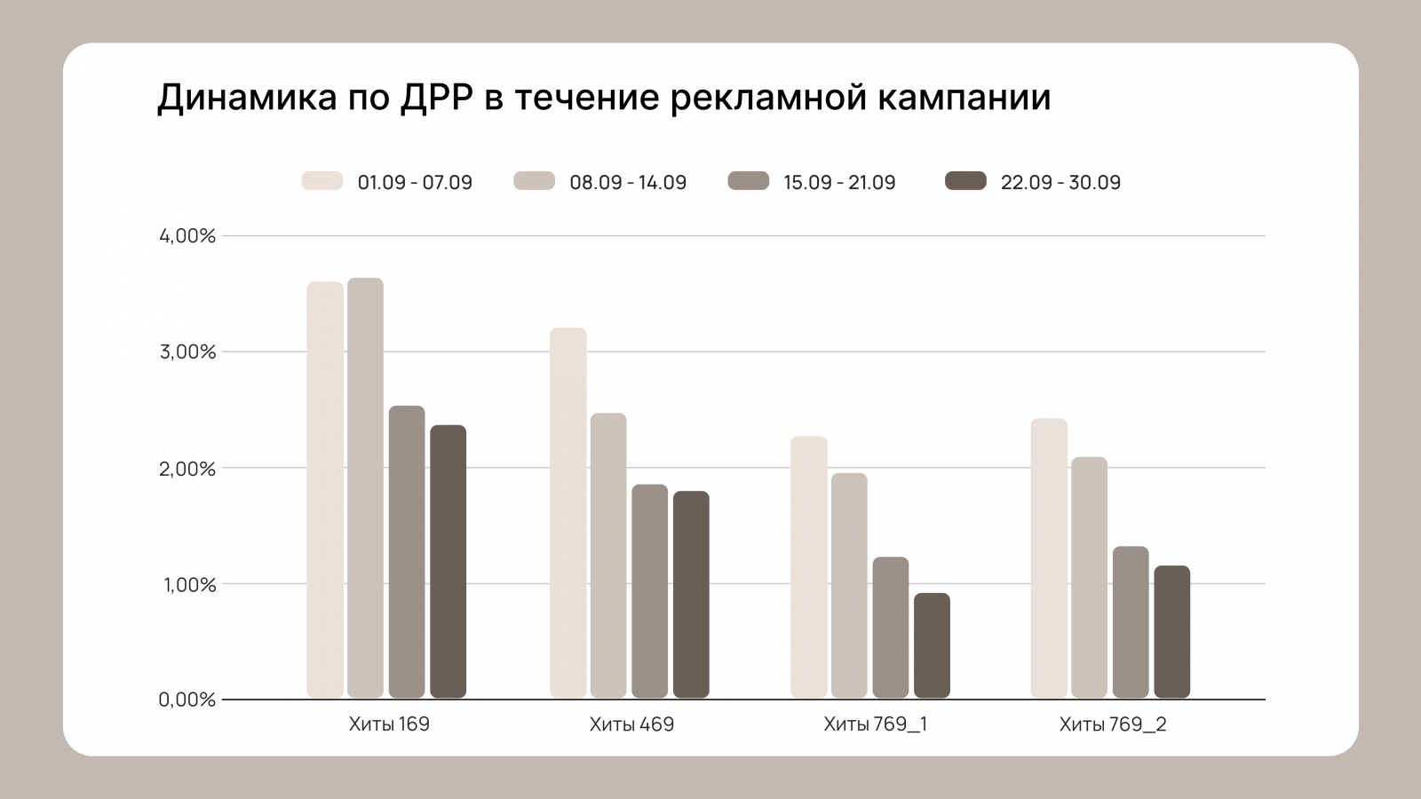 Кампания по «Хитам продаж», проведенная вместе с RTA и Hybrid, дала отличный результат. Ключевой показатель — ДРР с 30-дневной атрибуцией — составил 1,48% при цели в 10%. Мы превысили план более чем в десять раз.