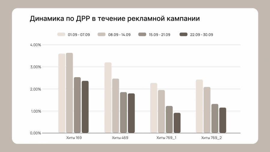 За счет накопленных данных за большой период размещений с клиентом нам удалось кратно превзойти план по основному KPI — поствью-ДРР. Наименьший процент ДРР показали подборки препаратов «769», что говорит о том, что с сохранением оптимально низкой цены закупки мы нашли аудиторию, которая заинтересовалась продукцией по более высоким ценам.
