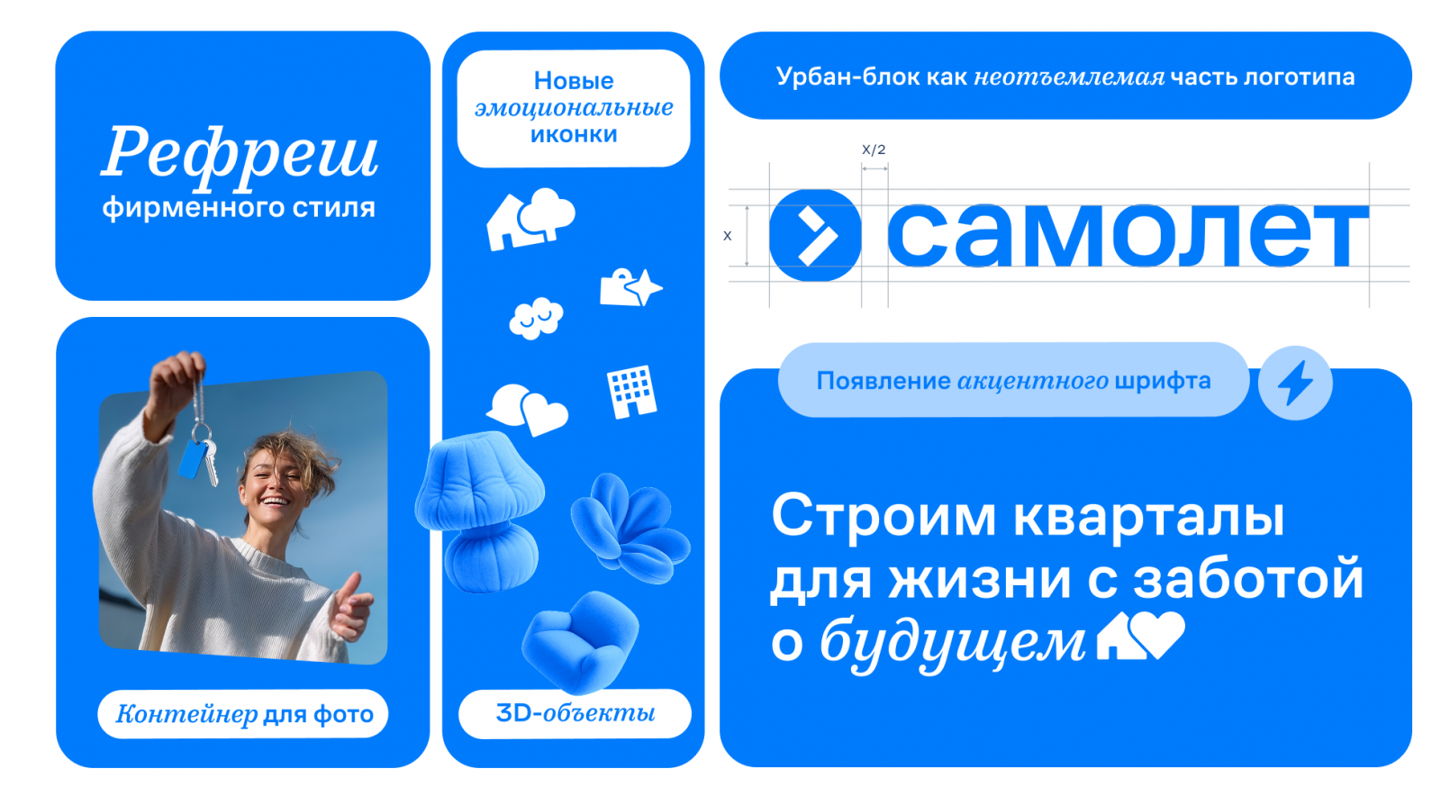 Застройщик «Самолет» обновил фирменный стиль, превратив набор визуальных приемов в дизайн-архитектуру: четкую, логичную, собранную из модулей и правил. Новая айдентика объединяет продукты компании — от жилых проектов до сервисов — в единую экосистему и помогает говорить на одном языке с аудиторией через разные каналы коммуникации. Команда проекта рассказала, как с помощью стиля сохранить узнаваемость бренда, отстроиться от конкурентов и акцентировать внимание на бизнес-подходе — создавать комфортную среду для жизни с заботой о будущем.