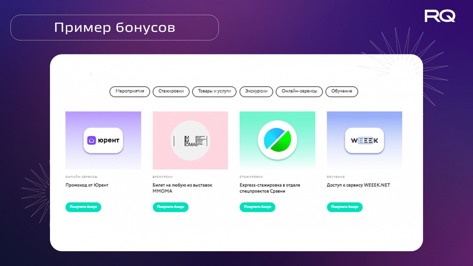 После выполнения заданий пользователю начислялись баллы. Чем сложнее задание, тем больше баллов. Их можно было обменять на бонусы: стажировки, образовательные программы, путешествия, товары и услуги, билеты на мероприятия и встречи со звездами.
