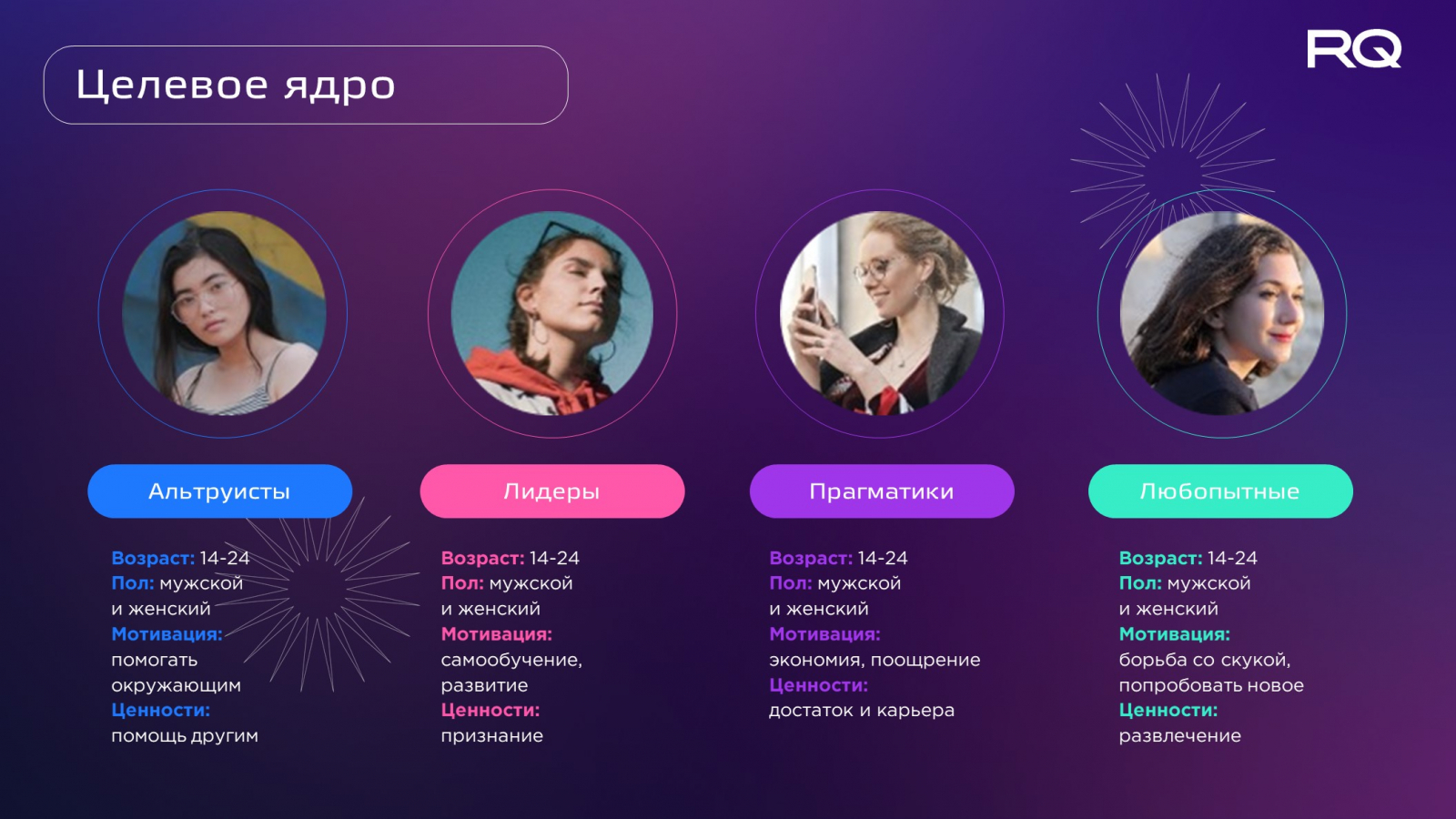 Целевая аудитория проекта — молодежь в возрасте от 14 до 35 лет. Целевое ядро участников — возраст от 14 до 24 лет. Мы разделили его по типу мотивации, ценностям аудитории и выделили четыре основные группы: