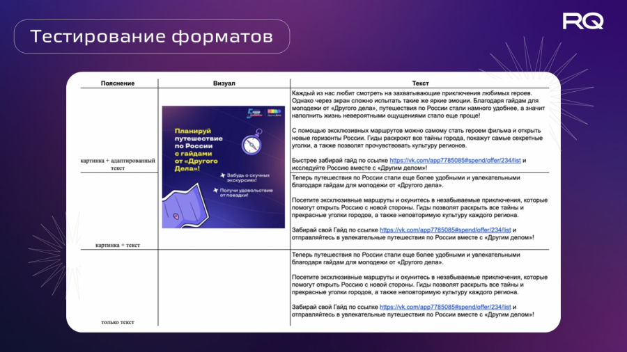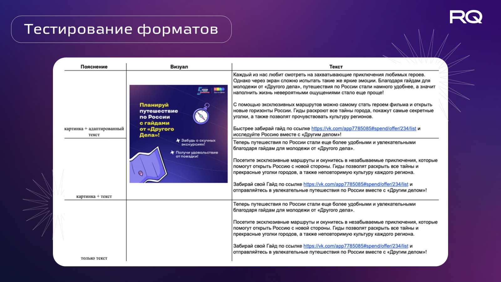 По результатам теста мы обнаружили, что наибольшее количество переходов обеспечивают креативы с текстом нашей редакции и визуальными элементами.