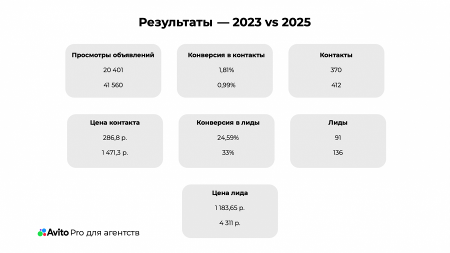 Несмотря на рост конкуренции и стоимости контактов в бизнес-нише клиента, в начале 2025 года SV-Digital удалось повысить все ключевые показатели в сравнении с 2023-м: