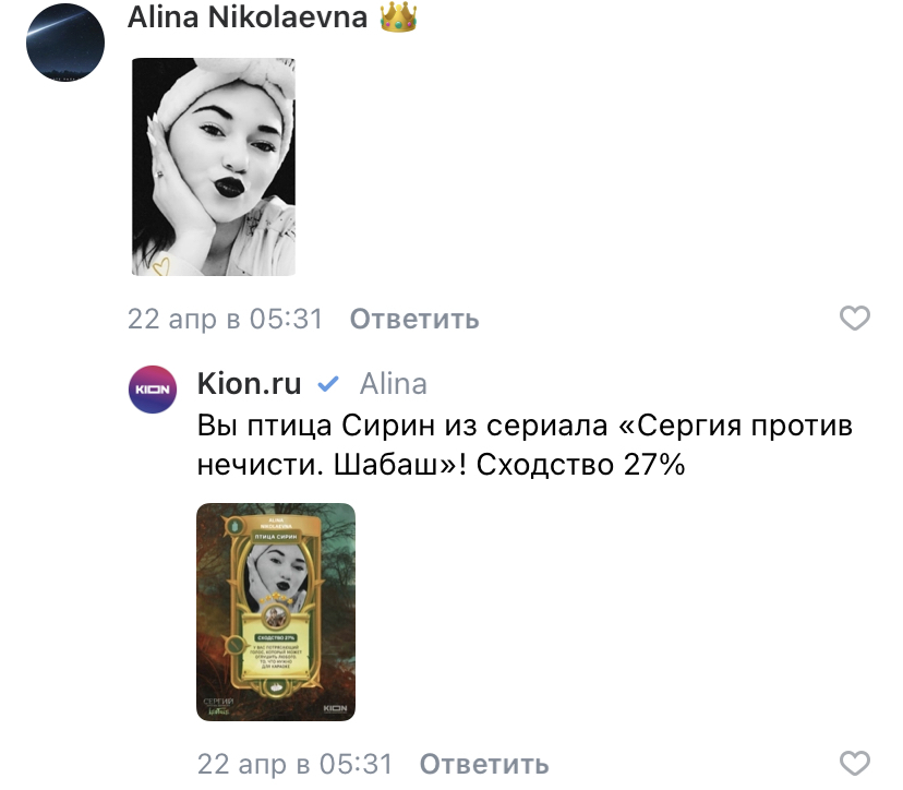 Одна из ярких тенденций последних лет — интерес к русской культуре и фольклору. Kion решил использовать этот тренд, чтобы создать увлекательную игру на основе русских сказок и мифов. В рамках этой игры, мы запустили бота «ВКонтакте», который предлагал пользователям узнать, кем они были бы, если бы жили в русских сказках. Для этого, мы просили пользователей делиться своими фотографиями в комментариях, и наш бот выдавал им персонализированную картинку с результатами. Это позволило нам взаимодействовать с нашей аудиторией и создать уникальный контент, основанный на популярных русских сказках с нечистью.