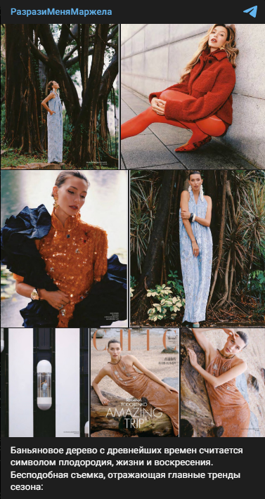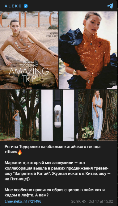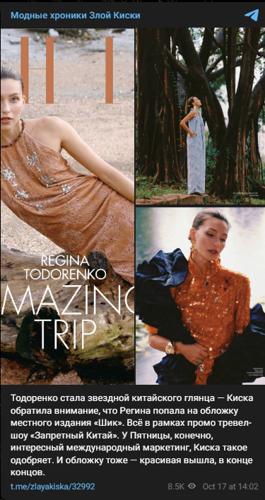 Образы Регины из журнала не обошли стороной российские глянцевые телеграм-каналы. Фешн-редакторы отметили трендовые образы и сам факт обложки в китайском глянце.
