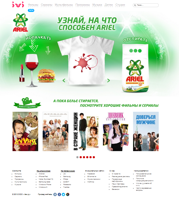 Решение: На промо-странице проекта была размещена белая футболка, «инструменты для пачкания» и порошок Ariel для «отстирывания». В легкой игровой форме пользователи сайта ivi могли проверить, что чем бы футболка ни была испачкана – порошок Ariel справится со всеми загрязненями.