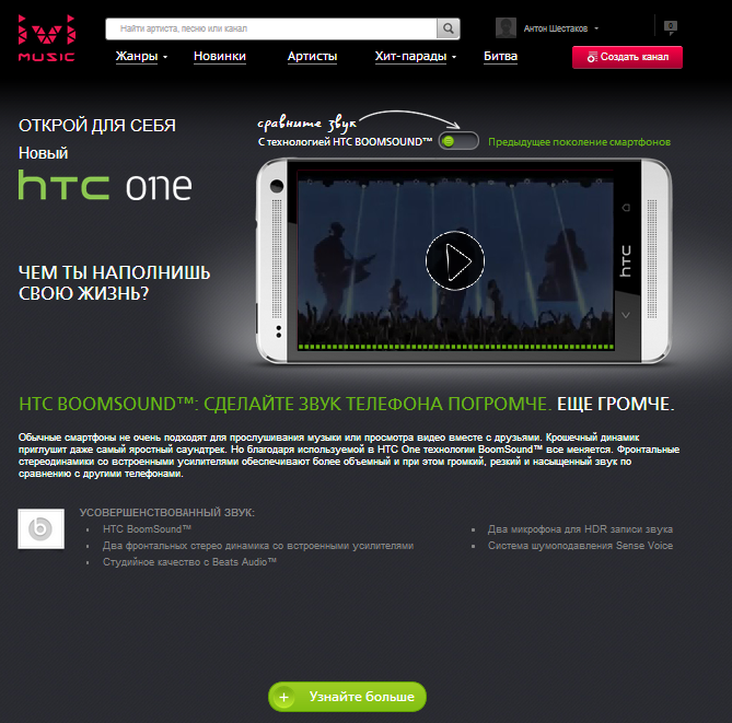 Решение: старт кампании был приурочен к запуску обновленного сайта www.music.ivi.ru. Компания HTC стала спонсором нового музыкального рекомендательного сервиса. Для коммуникации демонстрации преимуществ технологии BoomsoundTM в плеер для проигрывания клипов был интегрирован виджет, включение которого изменяло звучание музыкальной дорожки. Пользователи наглядно могли сравнить звук в смартфонах «предыдущего поколения» и объемное звучание с технологией HTC BoomsoundTM