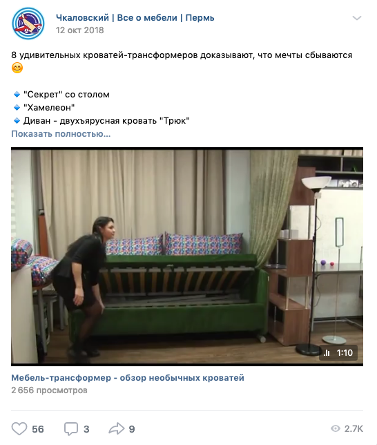 - Промопосты с «Задача — решение» (например, сколько стоит обновить мебель в гостиной своей бабушки).
